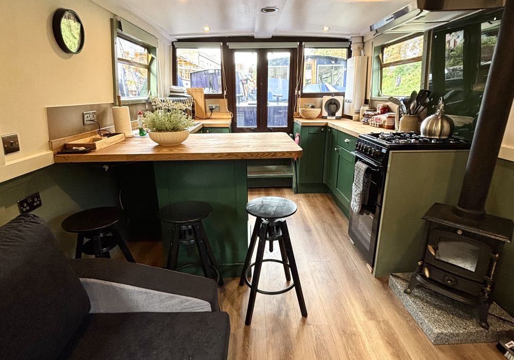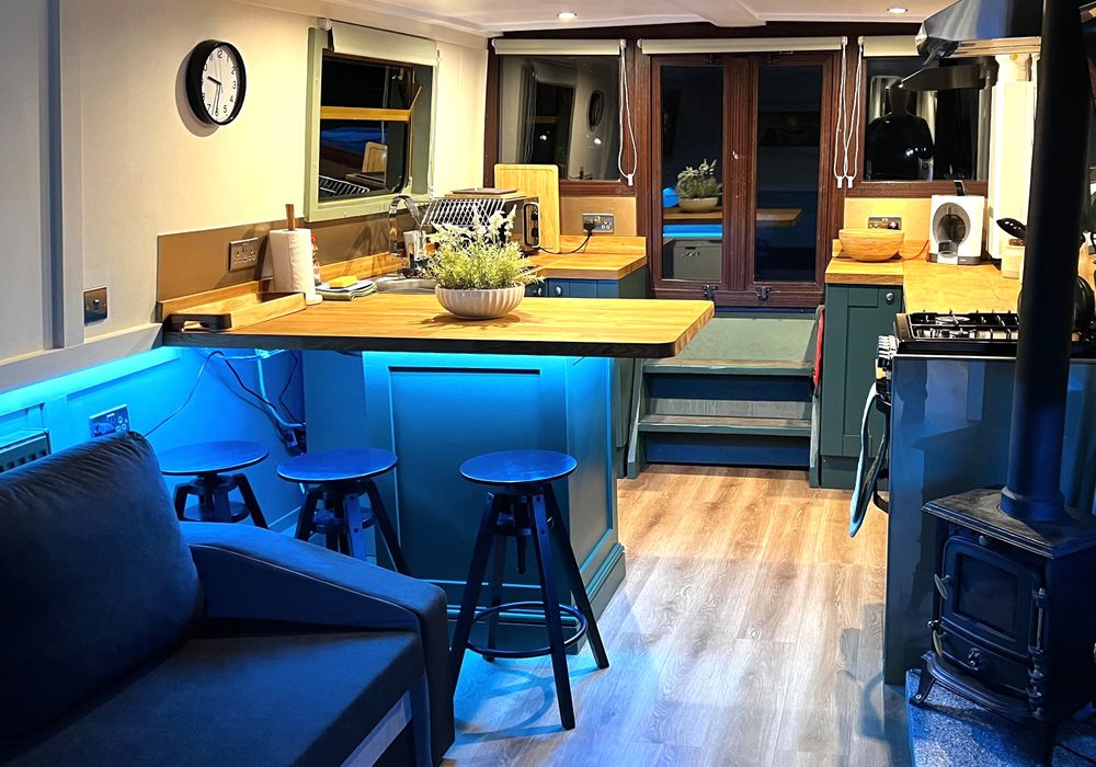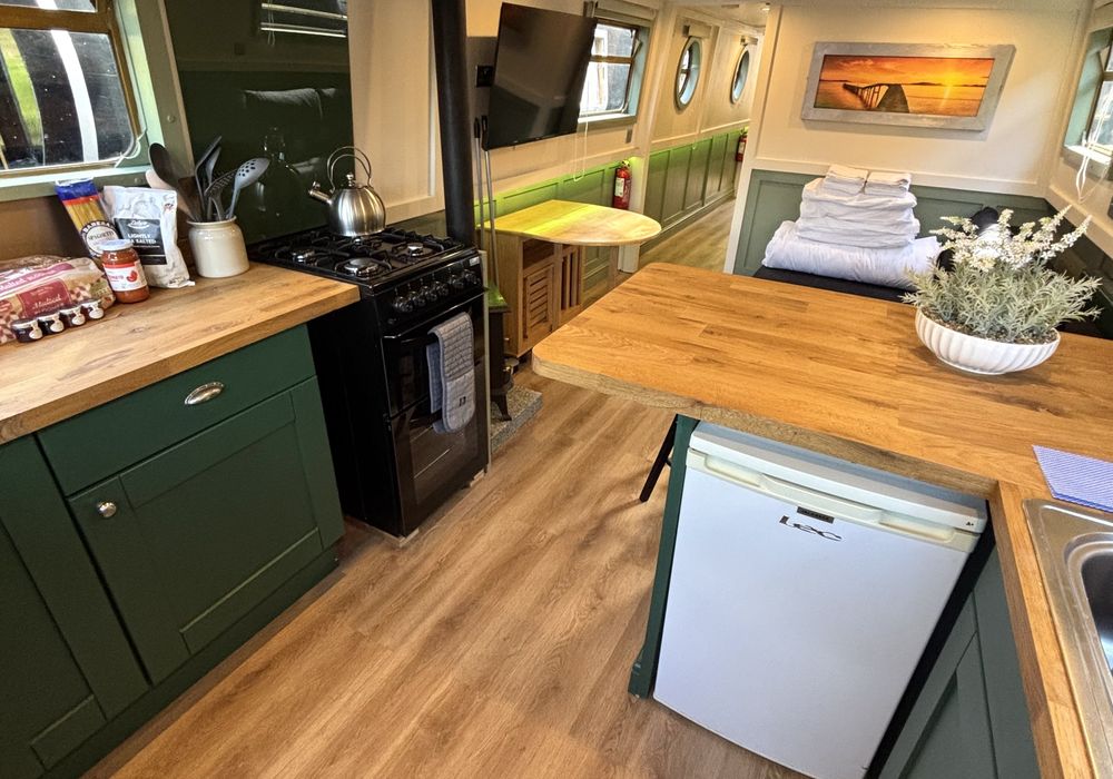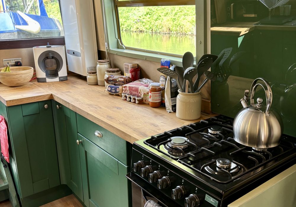 Top Notch is our 55ft wide-beam boat. She's much more spacious than a narrowboat. She has six berths, with one double cabin, a second bedroom with a choice of a double or two single beds and a small double sofa bed in the lounge. On entering the boat from the stern, you'll find the galley, complete with fullsize cooker, fridge with top shelf freezer . The open galley has an L shaped work top with cottage style cupboards.